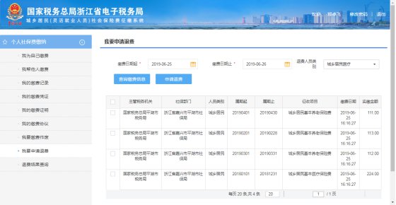 点击左侧任务栏【我要申请退费】,选择缴费日期起止、退费人员类别(可空),点击【查询缴费信息】。勾选需要退费的缴费记录并点击【申请退费】,填写《社会保险费退费申请表》后点击保存,退费申请将推送至社保进行审核,具体情况可在【退费结果查询】中查看。此处只能申请登录人员本人的退费,不支持代他人申请。