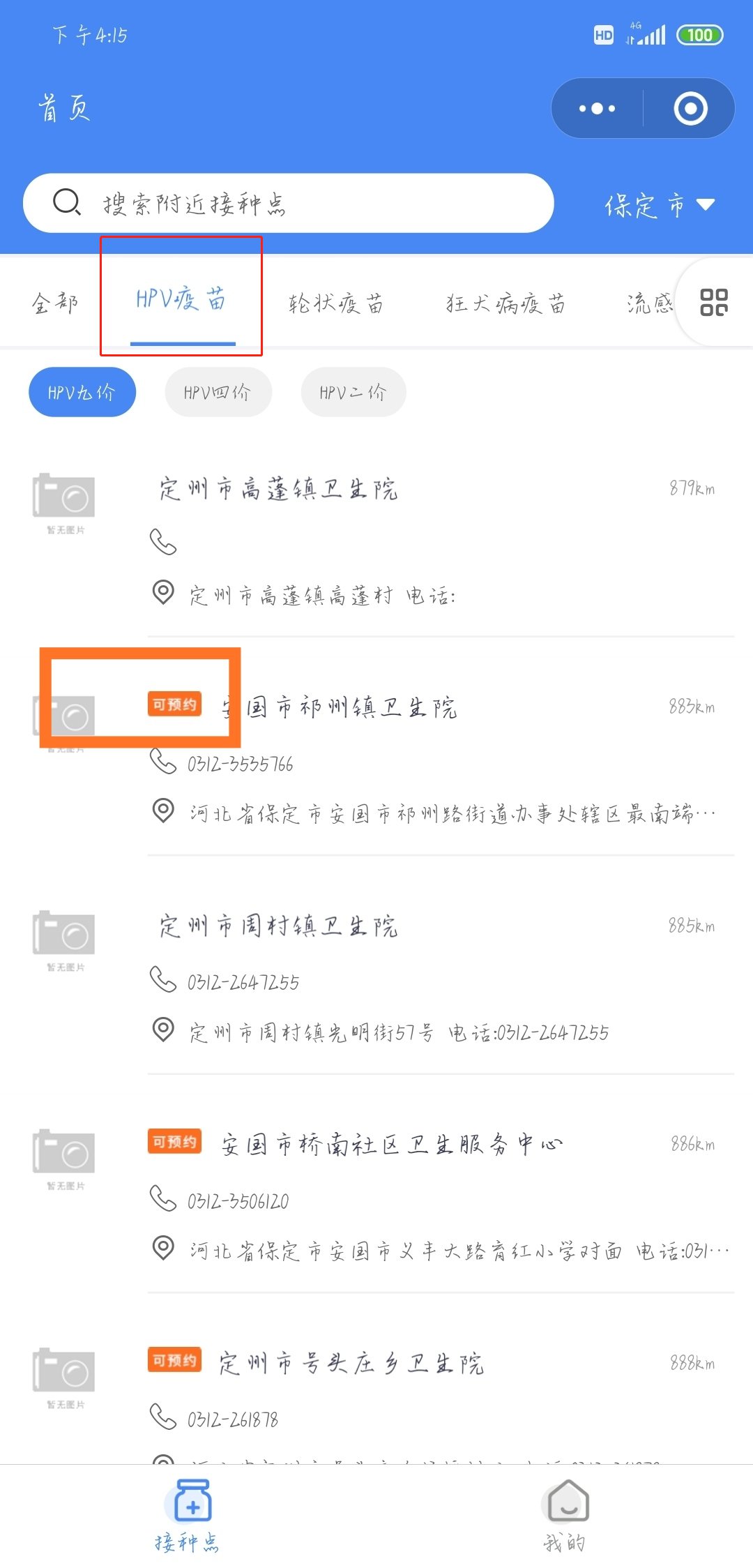3、选择HPV疫苗,选择显示“可预约”的卫生院或者服务中心