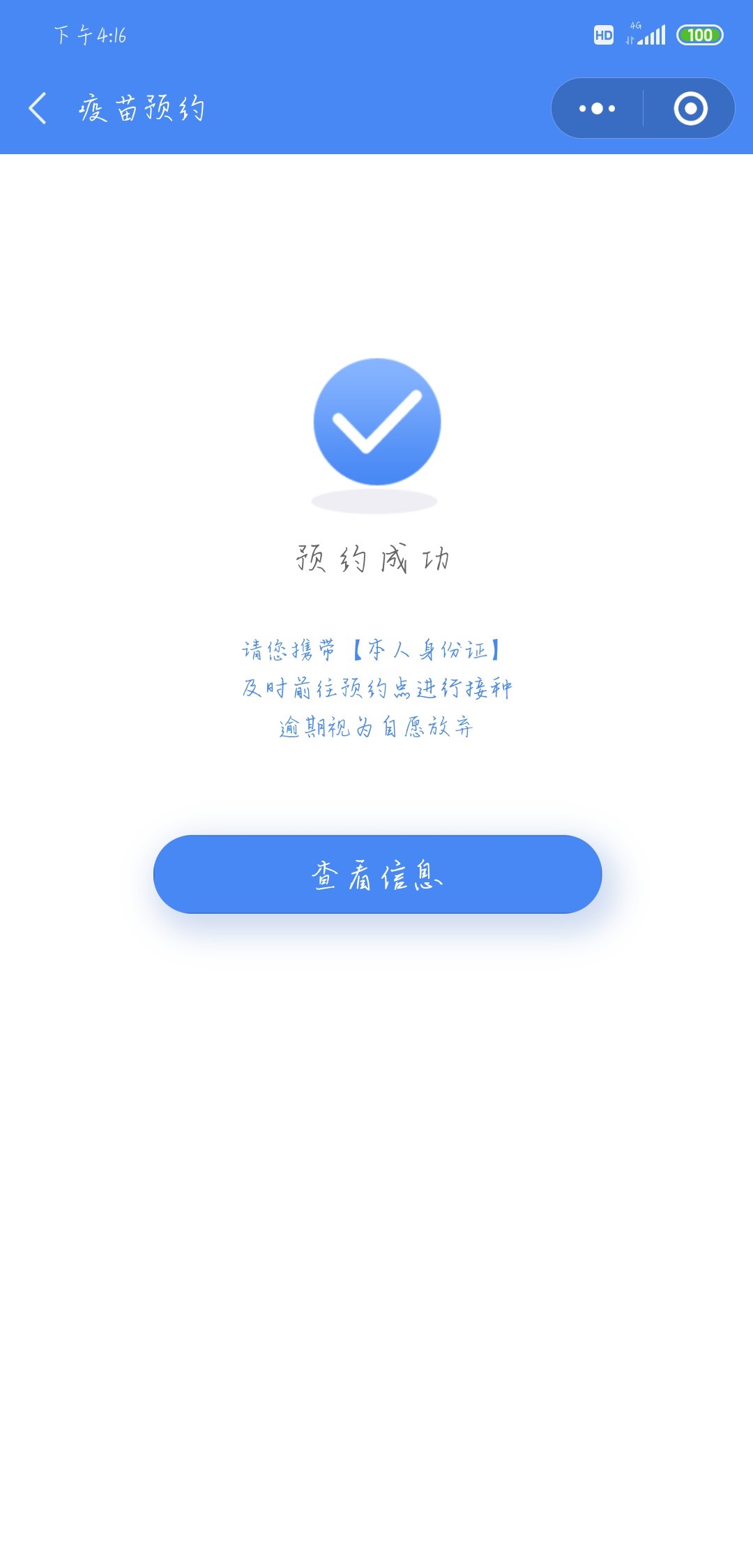 6、预约成功,携带本人身份证前往接种,逾期则自动放弃