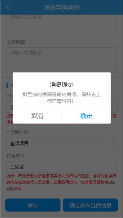 若承租户的房源是岛外房源,想要置换岛内房源,则系统会提示“拟互换的房源是岛内房源,需补充上传户籍材料!”