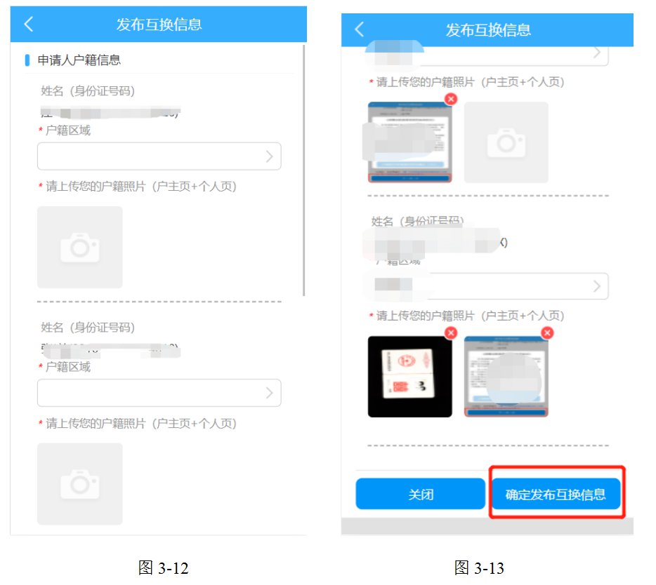 点击“确定”按钮跳转到所有申请人户籍信息页(如图3-12),填写所有申请人户籍区域、上传所有申请人的户主页和个人页照片。点击“确定发布互换信息”按钮,系统提交互换信息到后台管理员处审核。