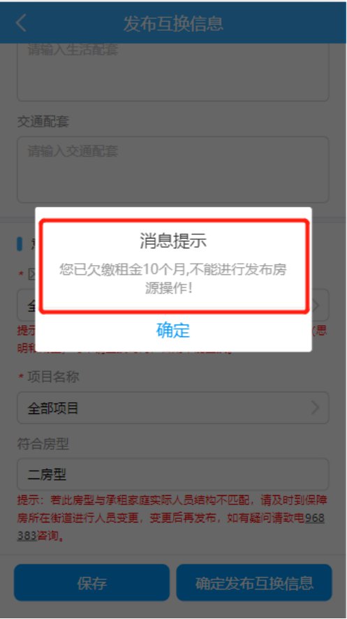 当承租户欠缴租金时,在点击“确定发布互换信息”按钮,系统会提示欠缴月数,承租户需补交租金后才能继续发布互换信息。