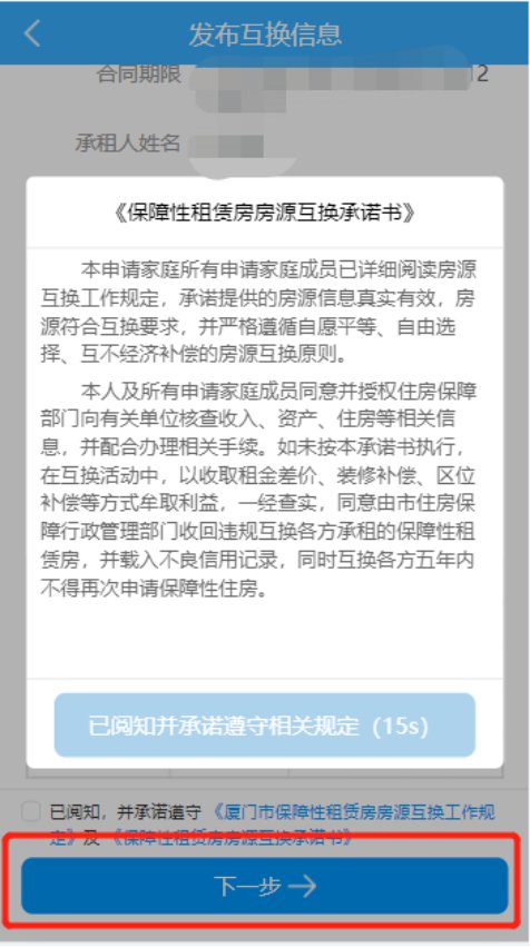 点击“下一步”系统会跳出《厦门市保障性租赁房房源互换工作规程(试行)》;