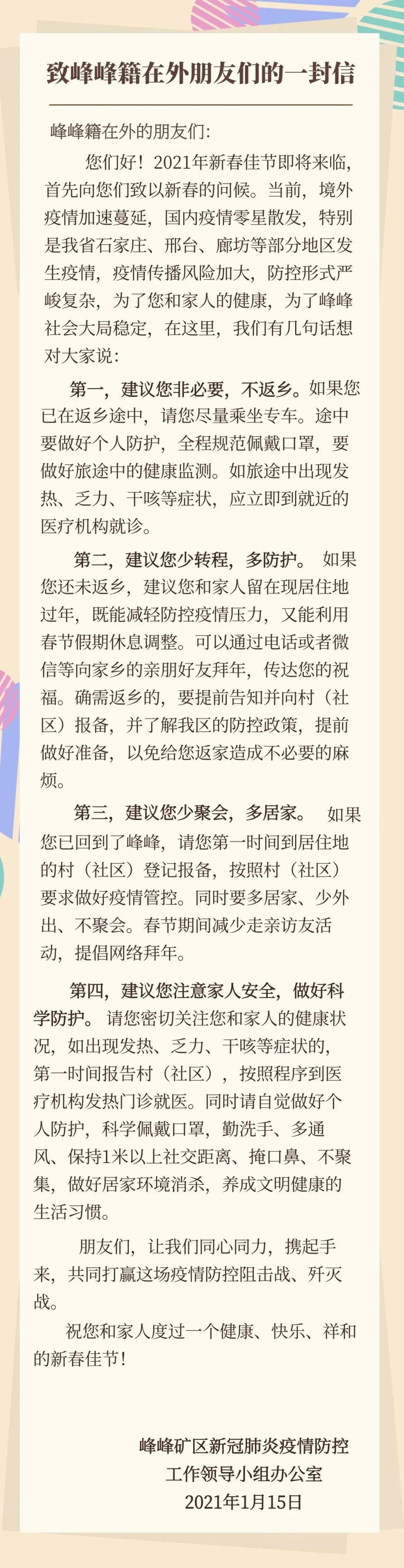 一、如非必要,请广大群众近期不要前往石家庄市藁城区、邢台南宫市。如必须前往,请务必提前向所在社区(村)、单位报备,并做好个人防护,并在返峰后严格落实常态化防控措施。