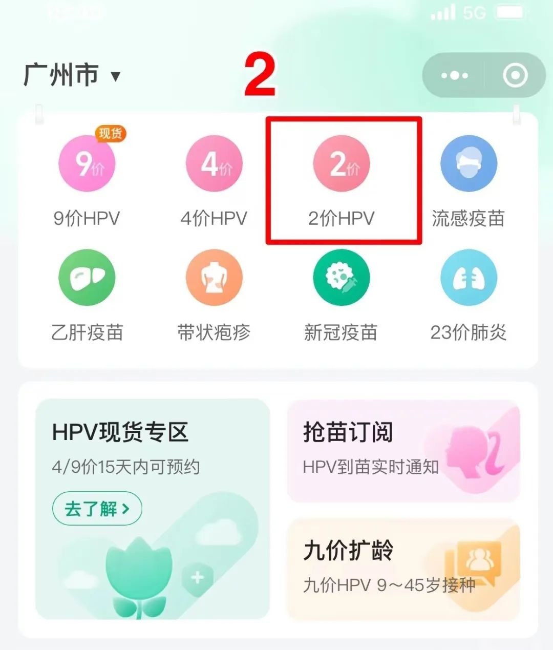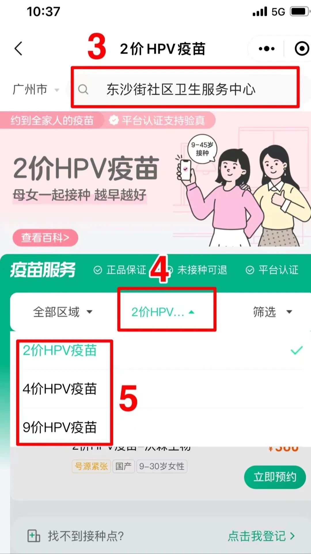 第二步:进去后,点击 “2价HPV” ,搜索“东沙街社区卫生服务中心”进行网上预约,如下图所示: