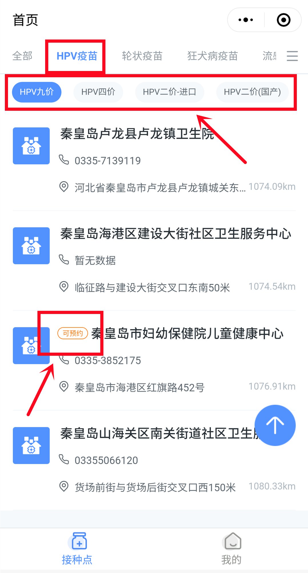 2、点击HPV疫苗,下滑页面可看到接种点,接种点名称前面有“可预约”代表有到苗/库存消息,可以进行预约