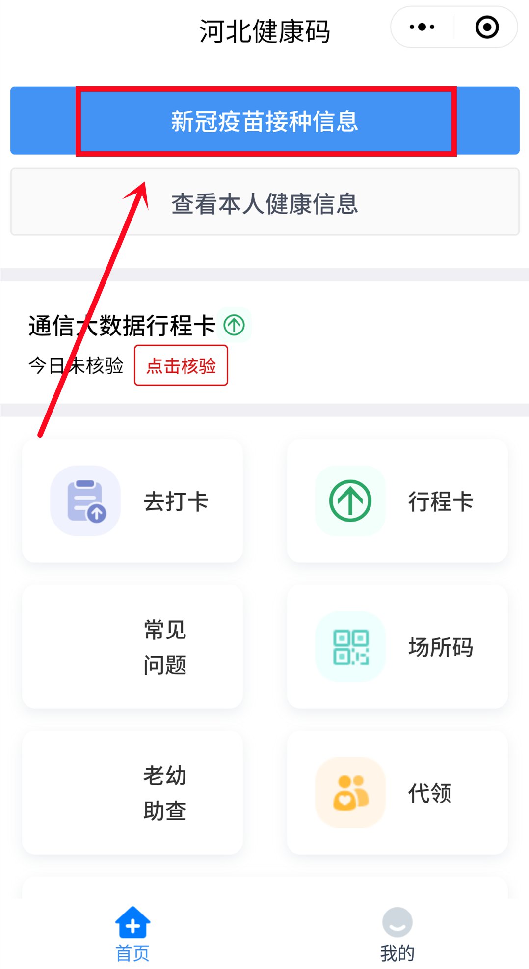 3、点击页面左下角的“首页”,往下滑动页面,看到并点击“新冠疫苗接种信息”,如有接种了新冠疫苗暂时没有显示的,可能存在系统延迟,可咨询防疫工作人员或出示纸质证明