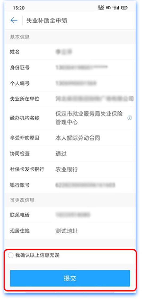 5、承诺未就业的进入申领审核,查看个人申领信息,确认无误后点【提交】;