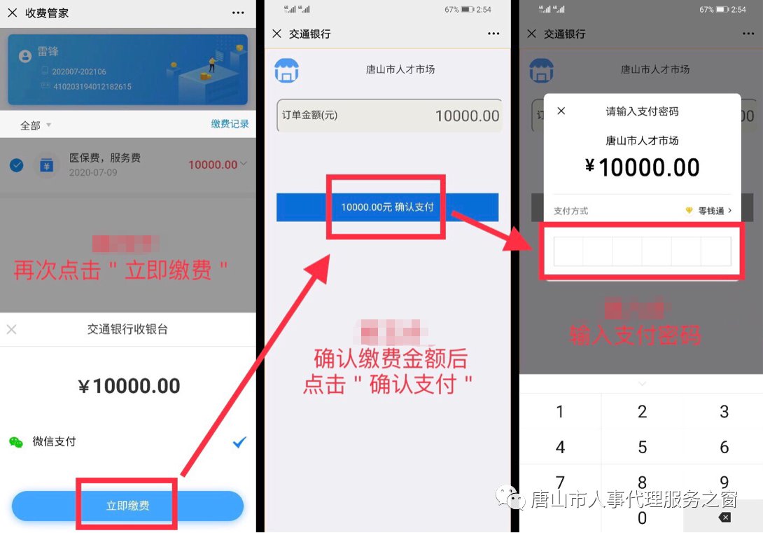 弹出“交通银行收银台”窗口,再依次点击“立即缴费”,“确认支付”,输入微信支付密码后完成缴费。