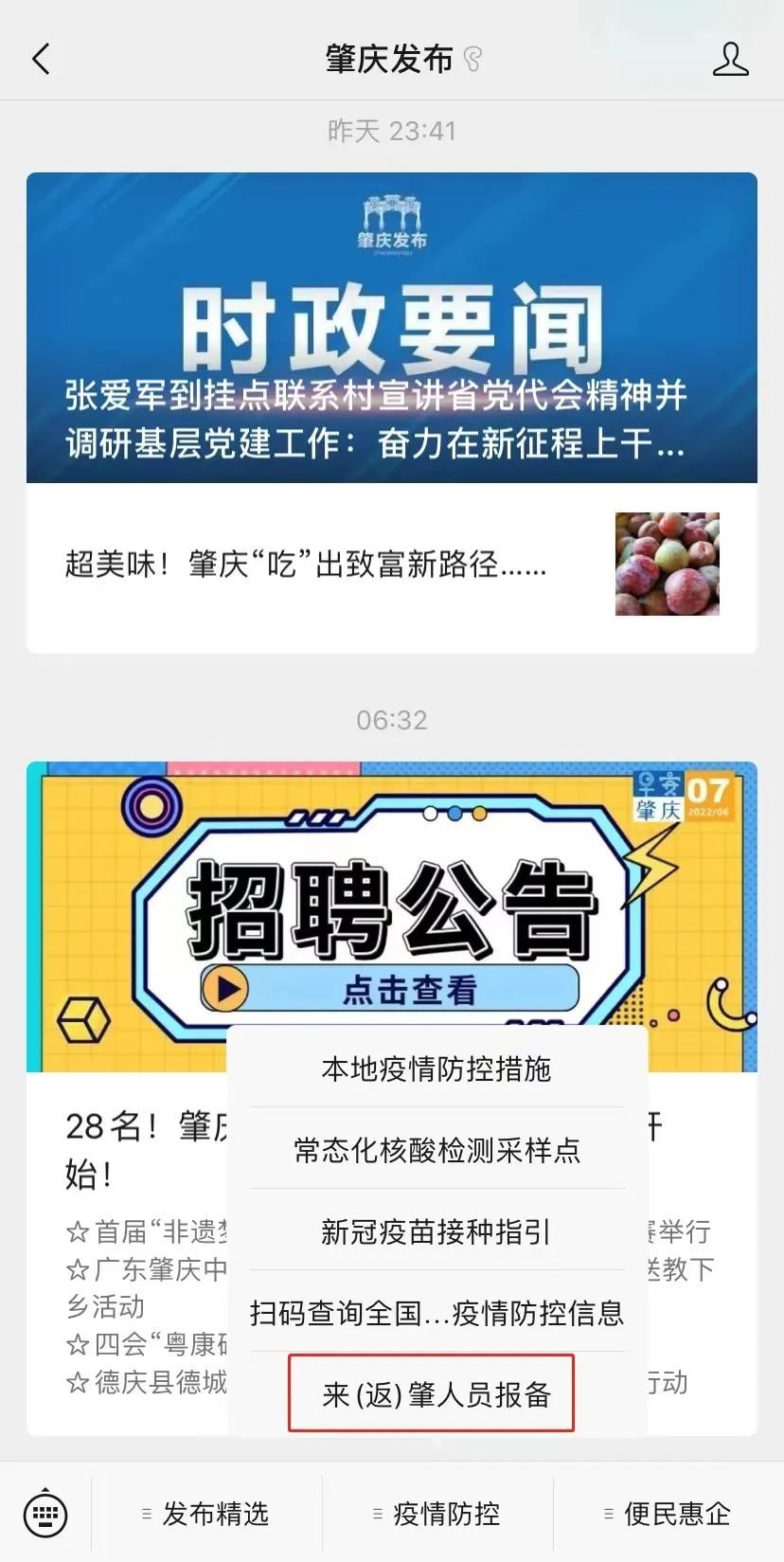 来(返)肇人员通过“肇庆发布”公众号或通过微信搜索“悠美肇庆”小程序进入来(返)肇人员报备系统。