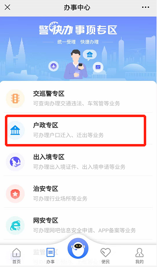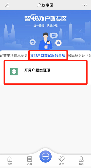 关注微信公众号“警快办”(或点此进入扫码关注),并实名注册认证。在“警快办”办事中心—户政专区—其他户口登记服务事项内进行申请。