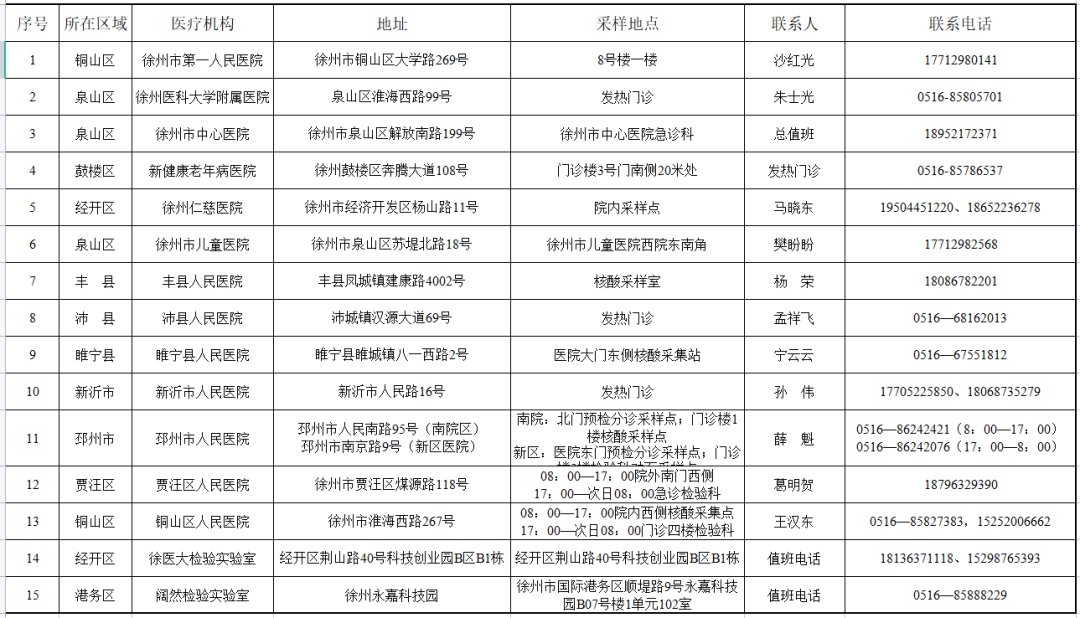 根据国务院应对新型冠状病毒肺炎联防联控机制医疗救治组关于进一步强化当前新冠病毒核酸检测服务工作要求,为科学精准防控疫情,更好地守护群众健康,进一步方便群众,10月29日徐州市卫生健康委发布《关于公布徐州市“愿检尽检”24小时核酸检测采样点的通告》,确定首批15家核酸检测服务机构(名单附后),为广大市民提供24小时核酸采样检测服务。