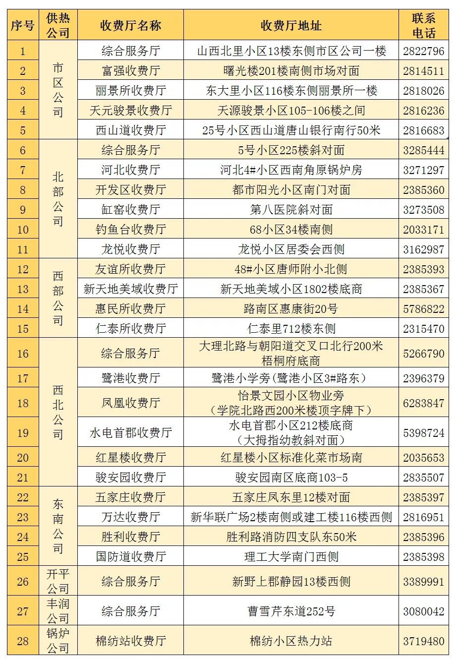 各热力收费厅的服务时间:自9月1日起至2021年12月15日,服务时间为每天上午8:30-12:00,下午13:20-18:00。