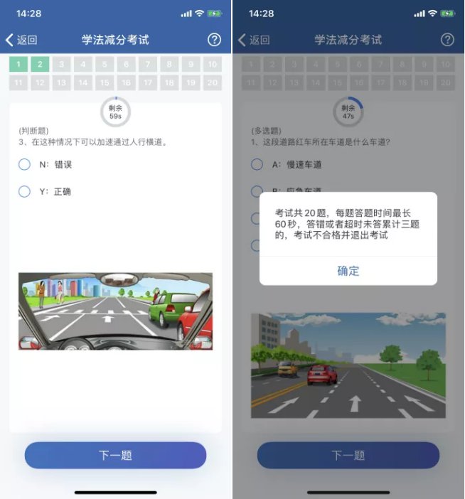 1、已完成学习的,驾驶人用户点击【学法减分】按钮,在已经完成学习的情况下,点击【前往考试】进入考试,如之前考试没通过且剩余考试次数还有的情况下,点击【前往补考】进入补考;
