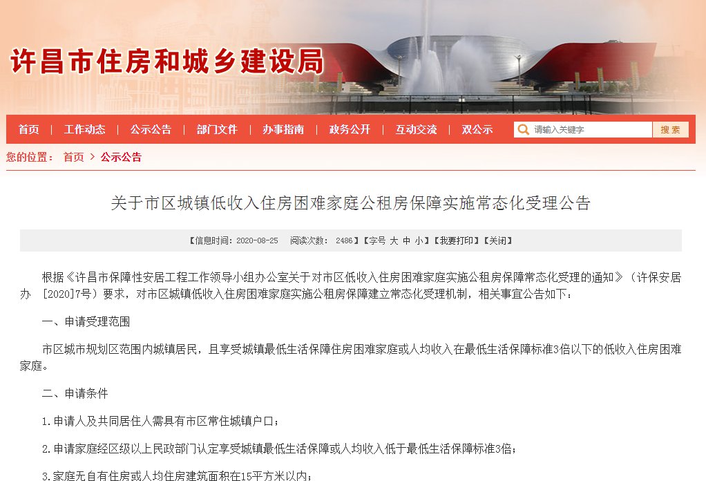 根据《许昌市保障性安居工程工作领导小组办公室关于对市区低收入住房困难家庭实施公租房保障常态化受理的通知》(许保安居办 [2020]7号)要求,对市区城镇低收入住房困难家庭实施公租房保障建立常态化受理机制,相关事宜公告如下: