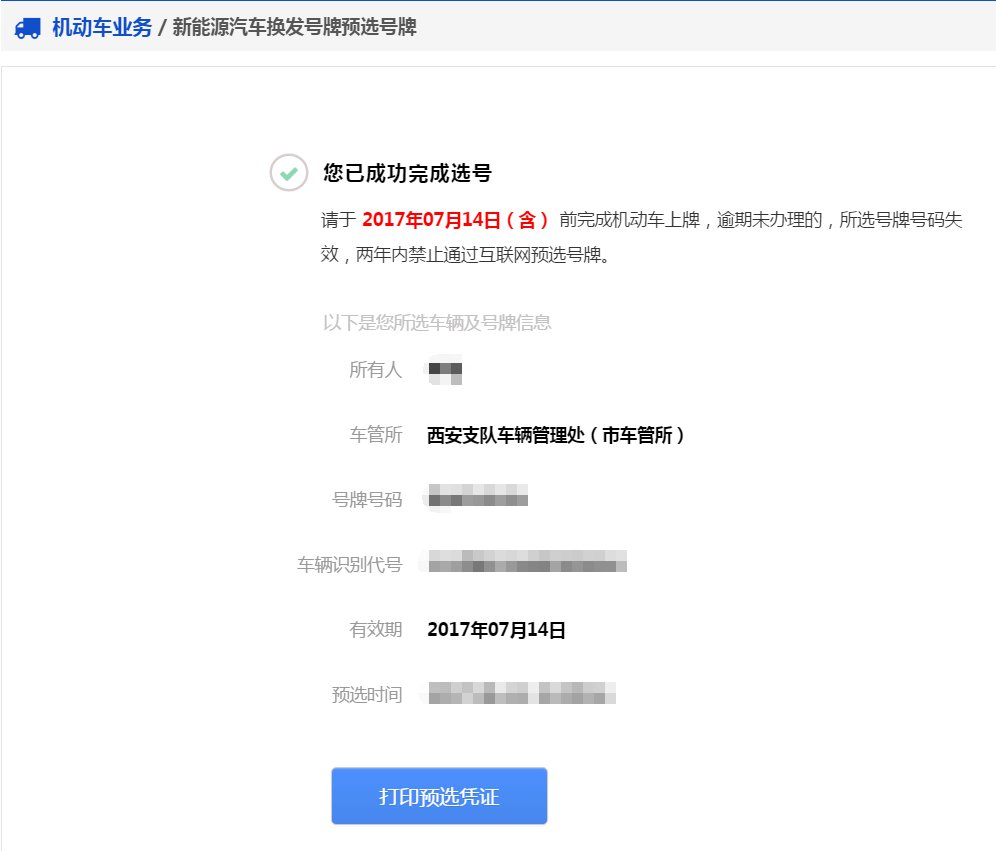 户完成选号后,系统将跳转到该步骤,如下图所示。该界面上显示了用户需要在哪一天之前去车管所办理换牌选号业务。 如果逾期未办理的,用户会被记入黑名单,不允许用户在互联网上进行预选号牌号码,2年后自动解除黑名单。