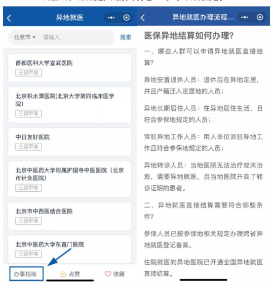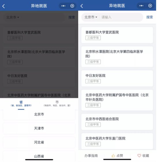 国务院客户端小程序的“异地就医”这项服务收纳了全国的异地就医定点医院,在搜索栏中选择省、区、市,就能快速查询该地方所有定点医院和办事指南!