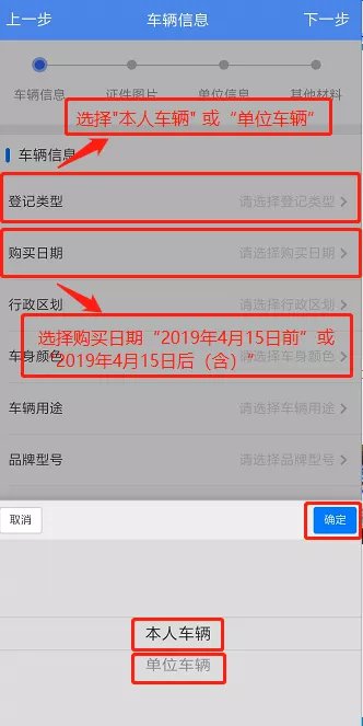 1.选择“本人车辆”或者“单位车辆”,点击 “确定”