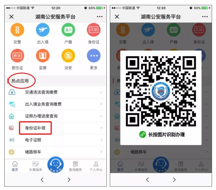 进入首页【热点应用】,点击【身份证补领】业务,长按识别页面上的小程序二维码