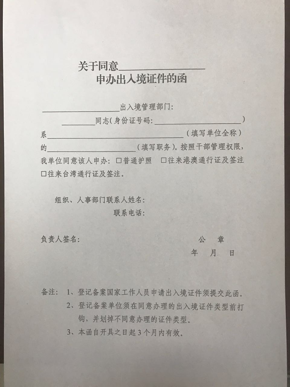 6、单位同意办理证件的函(仅限国家工作人员根据人事管理权限需要单位或上级部门同意的,须提交同意申办出入境证件的证明);
