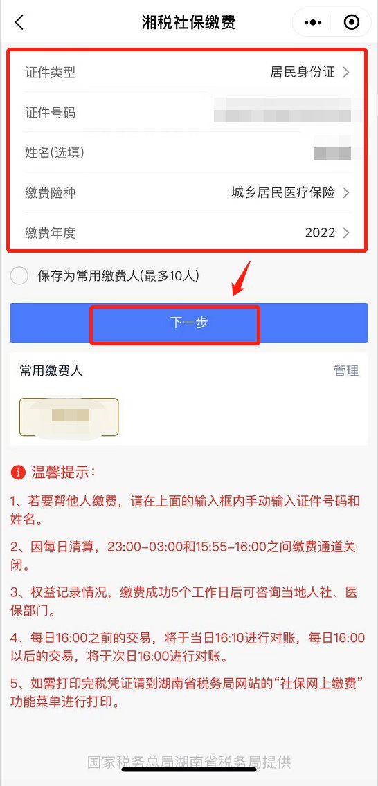 进入“湘税社保”小程序,登陆后在首页点击“城乡居民缴费”,填写证件类型、证件号码、姓名,选择“缴费险种-城乡居民医疗保险”,选择缴费年度,点击“下一步”,提交缴费完成即可。