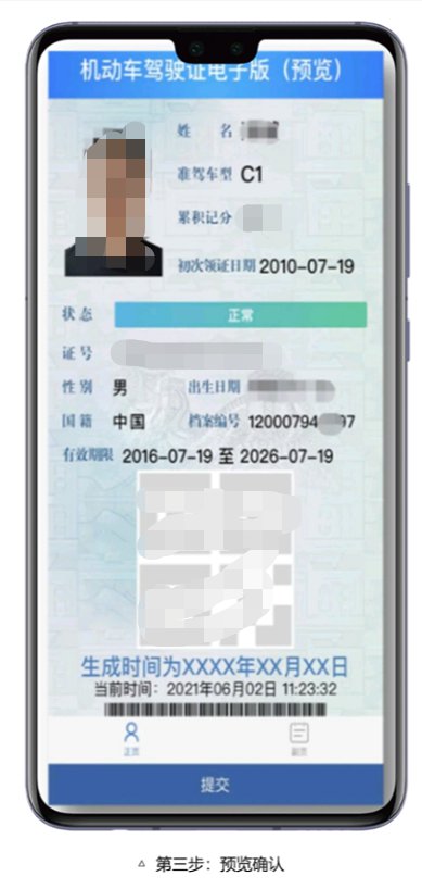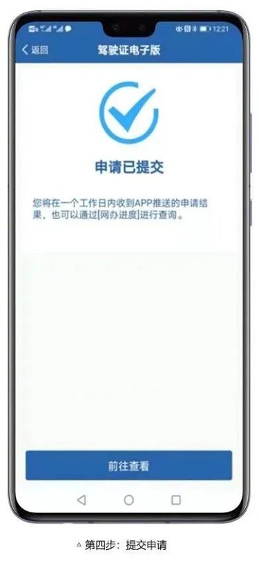 提交照片后,公安机关交通管理部门将及时线上审核,对符合要求的,“交管12123”APP将生成电子驾驶证,并推送申请成功信息。