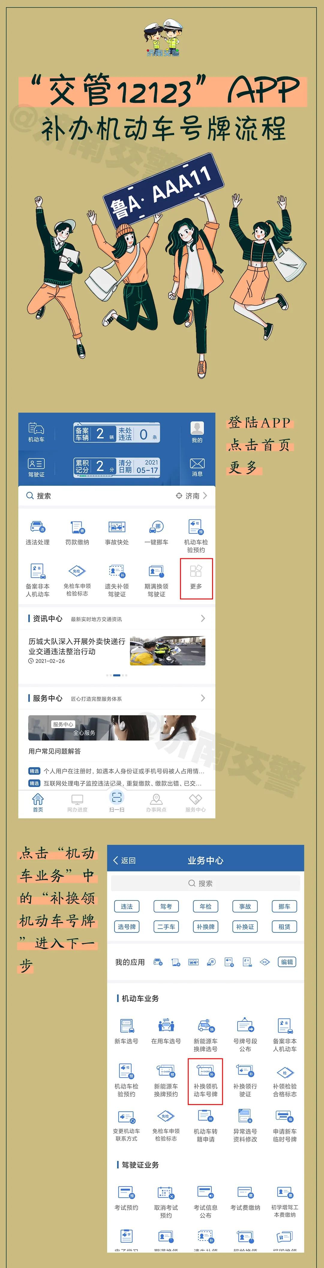 电脑端登录sd.122.gov.cn(交通安全综合服务管理平台)或手机下载“交管12123”APP客户端,实名认证注册后登录,备案车辆后即可在线申请“补换领机动车号牌”。