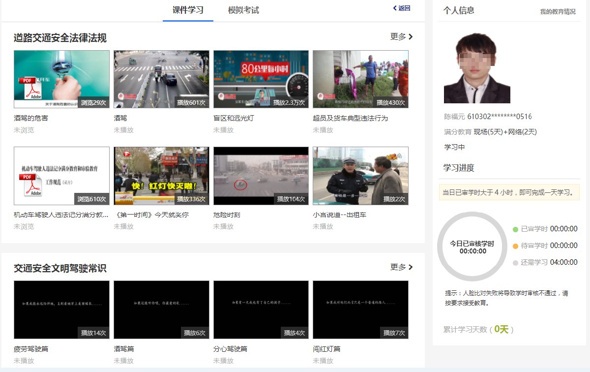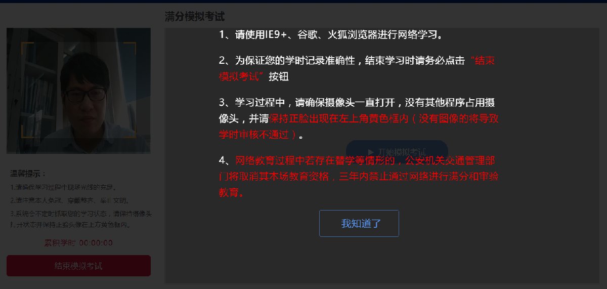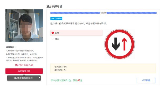 满分网络学习形式包括 视频课件、文档课件、满分模拟考试。学习过程中必须打开摄像头,系统不定时抓拍学习照片,有异常情形的系统记录嫌疑。当天累计学满 3小时 ,由管理员审核通过后,视为当天教育完成。7天满分教育完成后即可办理预约满分考试。