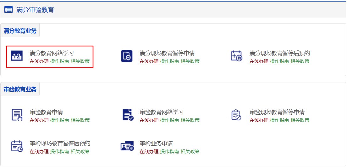 互联网注册用户在登录后,若已申请满分教育现场+网络学习方式,并在当天没有预约现场教育的,可以点击【满分审验业务】→【满分教育网络学习】进入满分教育网络学习流程。