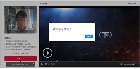 (4)系统将累积您当天的学习时间,若您中途有事离开或者暂时结束学习,请点击“结束学习”按钮。否则若系统抓拍到您未在电脑前学习,将导致当前学习记录审核不通过。