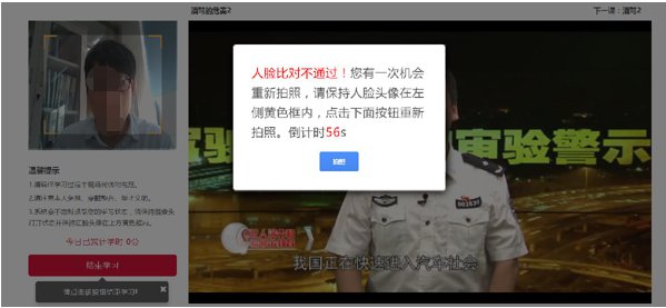 学习过程中,请确保您的人脸图像出现在左上角黄色框中间,清晰可辨。系统将不定时随机抓拍学习照片进行人脸比对,请将人脸正对摄像头,如下图所示。人脸比对不通过时,系统弹出提示框要求用户再次提交学习照片, 此时,请保持人脸头像出现在左上角黄色框内,并在60s内点击【拍照】,人脸比对仍不通过的将记录嫌疑。