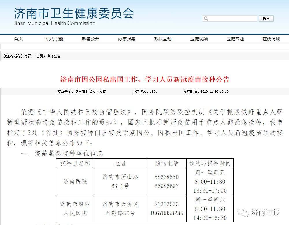济南市卫健委官网发布《济南市因公因私出国工作、学习人员新冠疫苗接种公告》。