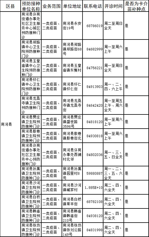 | 商河县 | 商河县许商街道办事处社区卫生服务中心城区预防接种门诊 | 一类疫苗、二类疫苗 | 商河县永安街19号 | 68786019 | 周二至周日全天 | 是 |