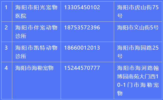 目前,海阳市暂定四家宠物医院作为犬只管理一站式服务点:
