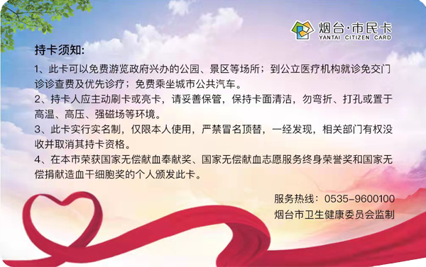 按照《关于贯彻落实烟台市无偿献血“三免一优”政策的通知》(烟卫医【2022】10号)规定,持卡者可通过刷卡或亮卡免费乘坐城市公共汽车,亮卡免费游览政府兴办的公园、景区等场所,到公立医疗机构就诊免交门诊诊查费及优先诊疗。