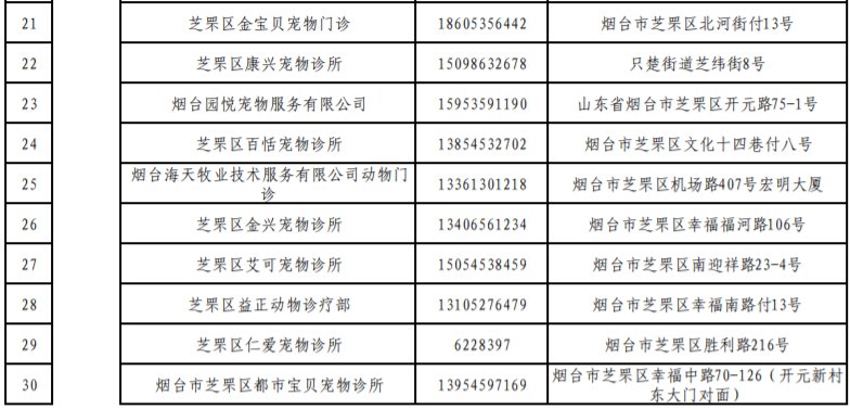 烟台市犬只狂犬病免疫定点机构公示(备案)信息表