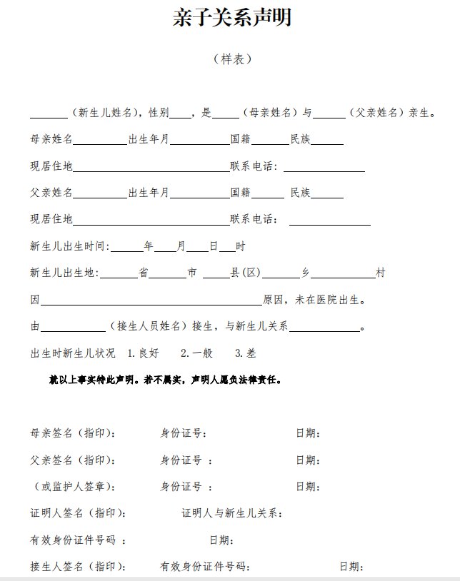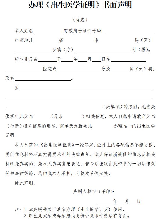 1.新生儿母亲一方申领出生医学证明且不能提供新生儿父亲有效身份证件原件的,新生儿母亲须出具书面声明(如下图),签发机构应在出生医学证明上父亲信息的相应一栏处标注“/”, 签发机构须将书面声明与存根一并保存。