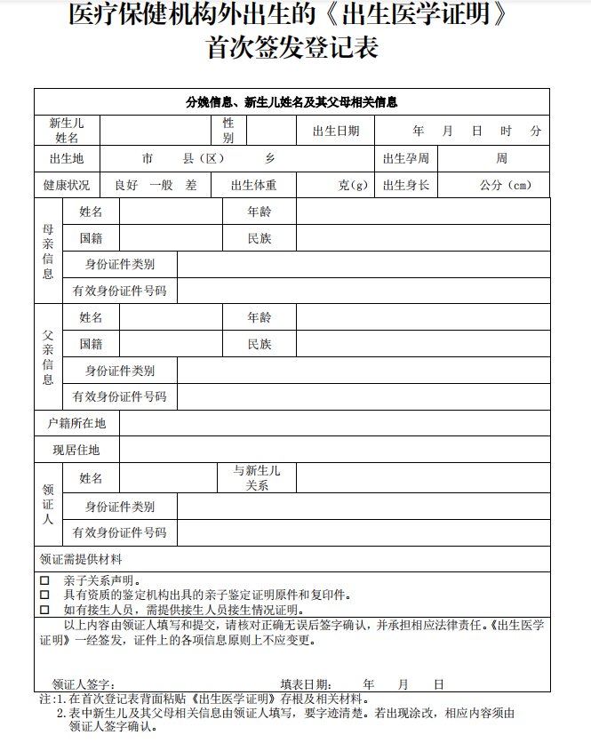(五)在不具有签发资质的助产机构出生的新生儿,以及在家中或途中急产分娩后送该机构进行断脐、胎盘、会阴撕裂等处理的,该机构要主动告知新生儿母亲及时向新生儿出生地县(市、区)卫生健康行政部门或其指定的机构申领出生医学证明。需提供以下材料: