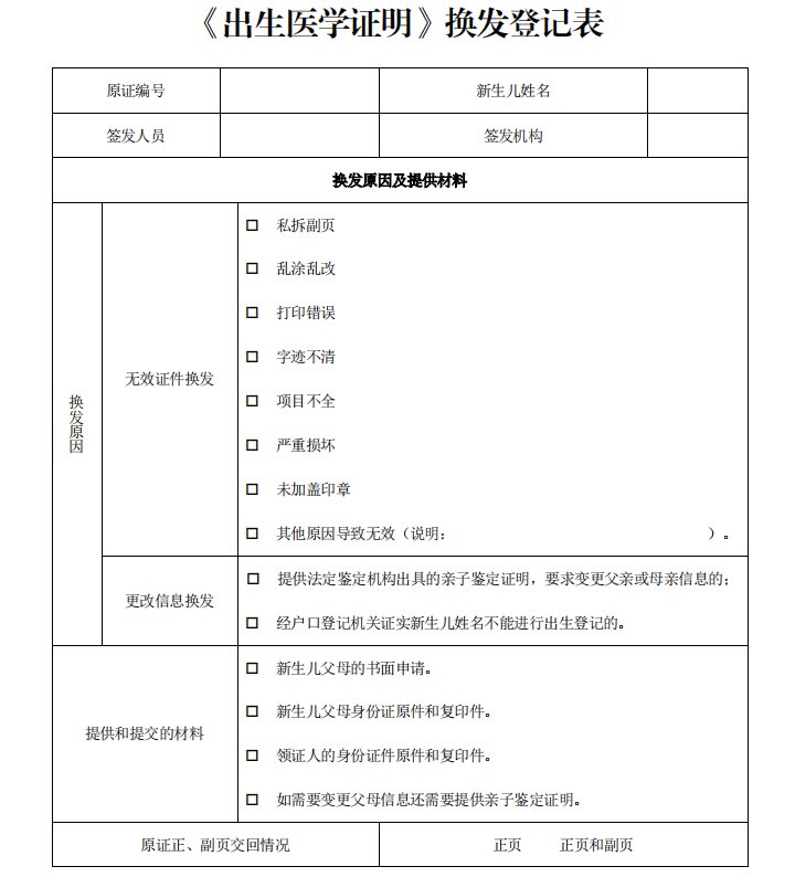 (四)原出生医学证明正副页和换发登记表(如下图)等;