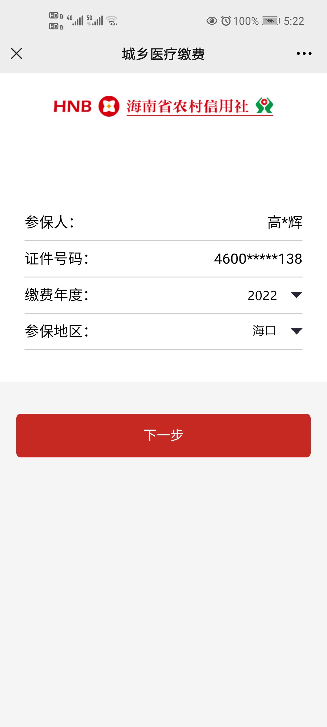 第三步:显示参保人证件号码和姓名,当前缴费年度默认显示为2022年,选择参保地区,点击下一步,如下图: