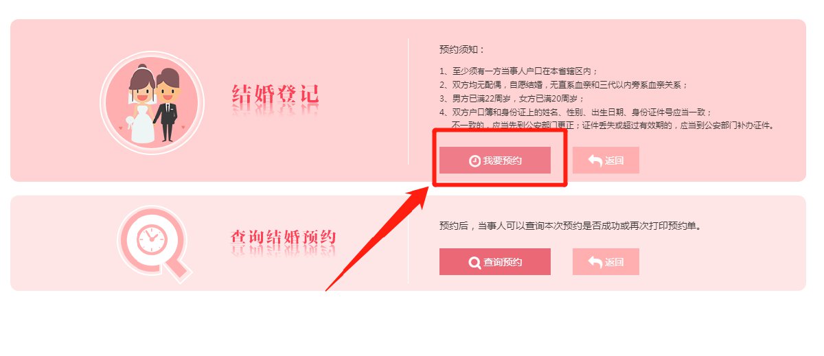 结婚登记预约时间:网上预约须提前两个工作日申请,受理日期为一个月(自然月)之内的工作日。