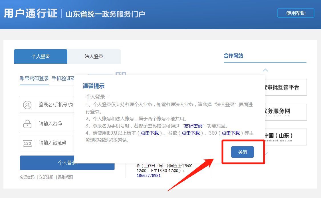 第三步:进入“山东省统一政务服务门户”网站,阅读提示并点击“关闭”