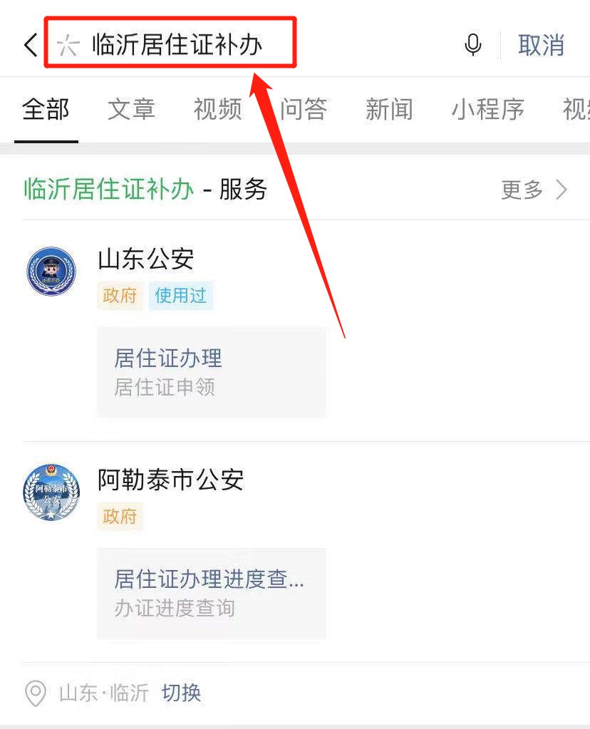 第一步:打开手机微信客户端,点击搜索栏,输入“临沂居住证补办”