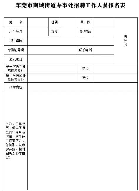附:东莞市南城街道办事处招聘工作人员职位表、报名表