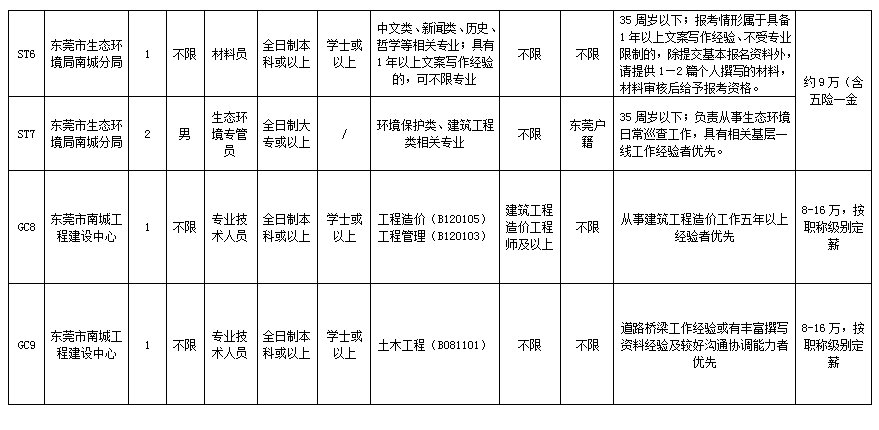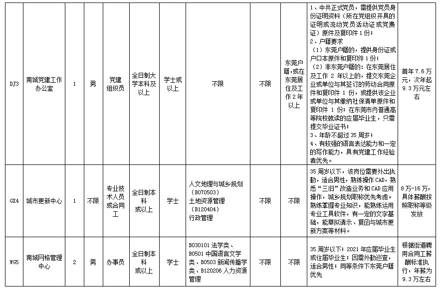 本次招聘工作人员共11名,其中东莞市南城街道经济发展局招聘工作人员1名、东莞市市场监督管理局南城分局招聘工作人员1名、东莞市南城街道党建工作办公室招聘工作人员1名、东莞市南城城市更新中心招聘工作人员1名、东莞市南城网格管理中心招聘工作人员2名、东莞市生态环境局南城分局招聘工作人员3名、东莞市南城工程建设中心招聘工作人员2名,具体招聘条件详见招聘工作人员职位表。