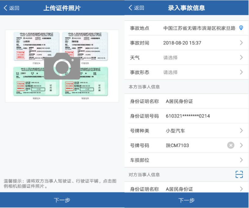 双方当事人撤离现场后,根据APP引导,需要拍摄双方证件照片和录入事故信息。