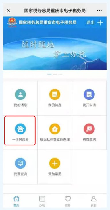 第一步:关注重庆税务微信公众号。选择下方功能菜单, “网上办税”-“办税服务”-“一手房交易"