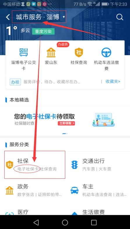 打开手机支付宝进入“城市服务”栏目,选择城市定位为“淄博市”,进入“社保”选项,点击“电子社保卡”,按照提示进行申领。