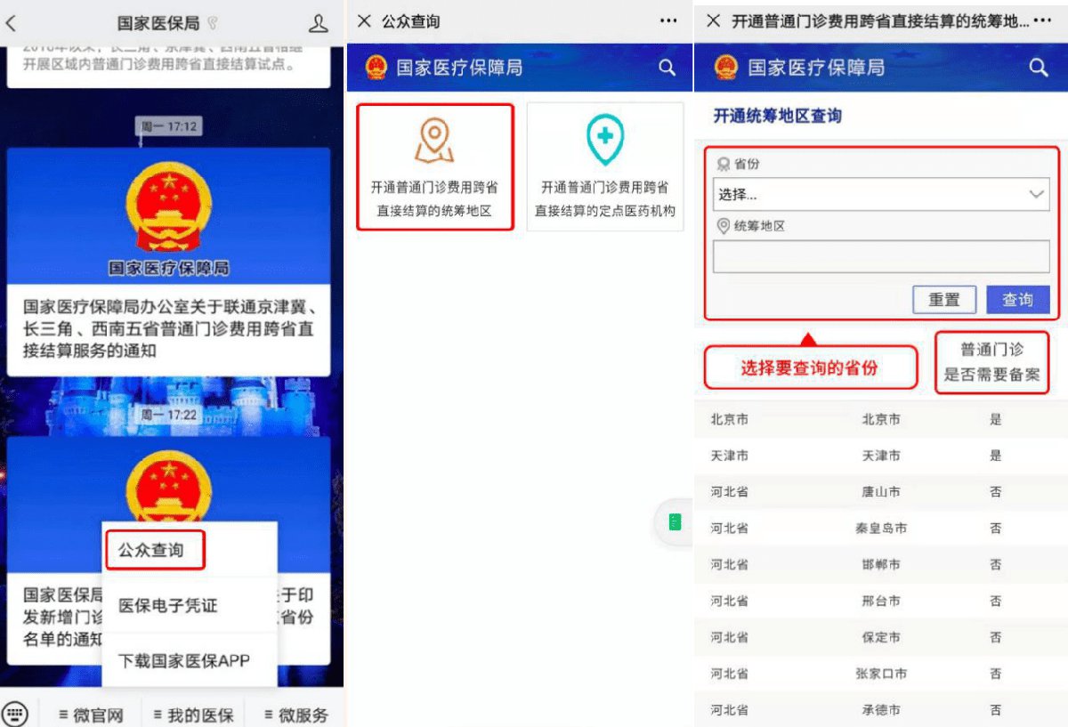 第三,可以通过国家医保局公众号查询所属参保地是否需要备案,也可向参保地医保经办机构咨询具体要求。