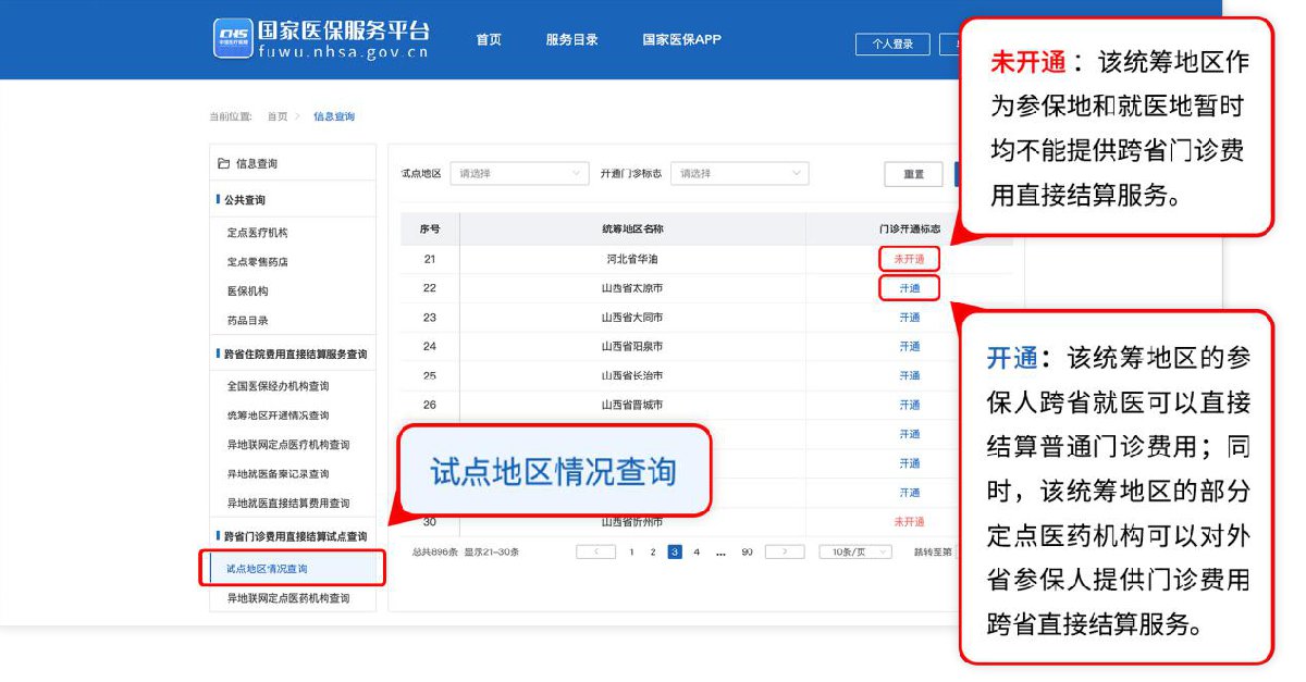 参保人可以通过国家医保服务平台网站(https://fuwu.nhsa.gov.cn)跨省异地就医查询版块查询跨省门诊费用试点地区情况。点击页面左下角“跨省门诊费用直接结算试点查询”按钮进入版块,左下角“试点地区情况查询”查询参保地统筹地区的门诊开通情况。门诊开通标志为“开通”,说明该统筹地区的参保人跨省就医可以直接结算普通门诊费用;同时,该统筹地区的部分定点医药机构可以对外省参保人提供门诊费用跨省直接结算服务。门诊开通标志为“未开通”,说明该统筹地区作为参保地和就医地暂时均不能提供跨省门诊费用直接结算服务。
